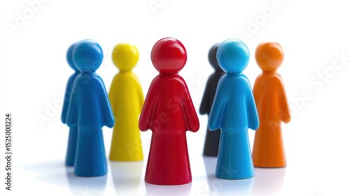 A red and blue figurine standing out from a group of yellow and black figurines against a white background.