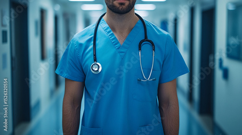 A dedicated doctor in scrubs stands ready to heal and comfort patients in the hospital captured with a focus on medical