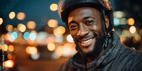 Friendly African American delivery courier in his 20s smiles, wearing a helmet. He stands with his electric scooter on a bustling city street at twilight.