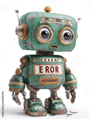 Confused Cartoon Robot With an ERROR Sign and an Open Top Zone Seeks Solutions to Its Malfunction in a Whimsical Setting