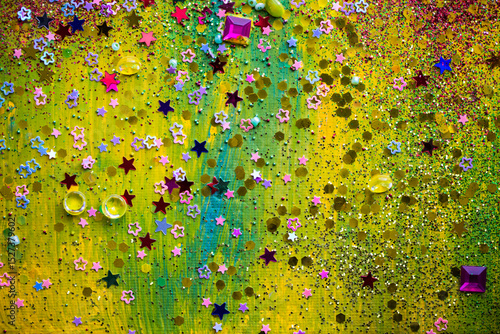 A colorful, textured abstract artwork created with handmade paint and spontaneous creative brush movements