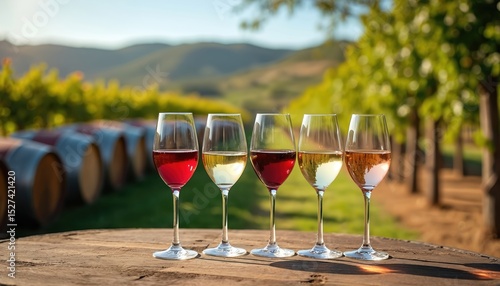 Wine tasting experience in Napa Valley. Various red and white wine glasses against vineyard background. Rustic wooden table with barrels, scenic outdoor. Enjoy elegant drink, beverage during vacation.