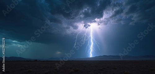 Long shot of powerful lightning strikes during thunderstorm at night sky. Dark storm clouds, dramatic weather, natural disaster, climate change concept. Electric strikes over landscape.