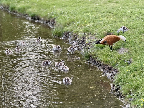 Mother and father Ruddy shelduck with her small ducklings on lake in the summer. It is a waterfowl of the duck family, similar to the common one. The bird has orange-brown plumage and a lighter head