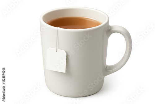 Ceramic white mug steeping herbal tea bag, warm liquid creating rich aromatic infusion against clean light background