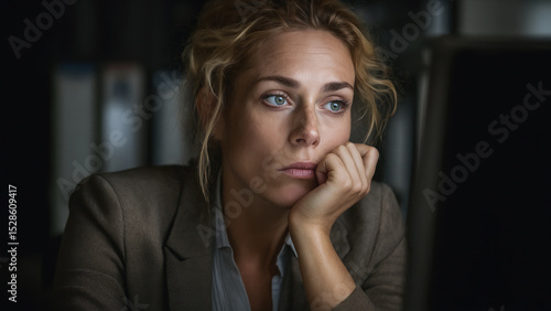 An over-worked office employee staring absently at her computer. Chin resting on hand. Blank, disintereated expression.