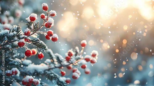 Tranquil snowy scene featuring evergreen boughs and vibrant red berries dusted with snow, bathed in sunlight with soft snowflakes falling