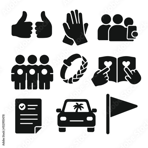 Group Travel Rituals. Solid, Filled icon set of group travel rituals: thumbs-up cheer, high-five, group selfie, matching shirts,