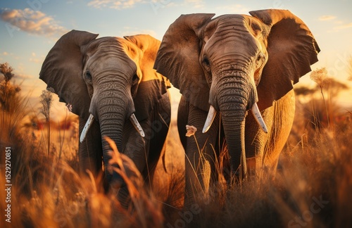 A heartwarming scene of two elephants standing together in golden light at dusk, embodying themes of connection, majesty, and the beauty of wildlife in their natural habitat.