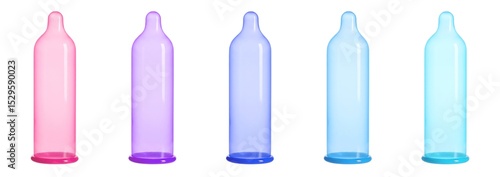 Colorful unrolled inflated standing condom transparent PNG set bundle, isolated background. Pink, purple, blue, cyan color. Condoms product presentation, safe sex contraceptive, male potency