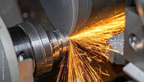 Precision metalworking: Grinding wheel sparks on a rotary workpiece close up view
