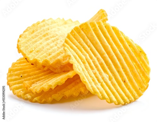 Close-up shot of ridged potato chips stacked in layers, isolated on a matte white background, hyper-realistic food photography