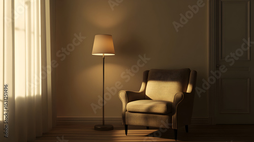 un sillon de una plaza indivudual junto a una lampara de pie encendida para iluminar el cuarto junto a un ventanal con cortinas