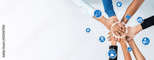 A vibrant illustration showing diverse hands joining in unity, surrounded by circular icons symbolizing collaboration, teamwork, and technology in a modern workspace. Amity