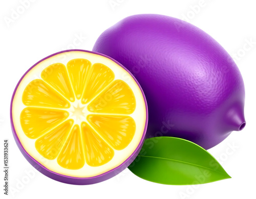 A Vibrant Purple Lemon with a Fresh Slice and Green Leaf