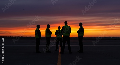 Silhouetted Figures at Sunset on Airport Runway Teamwork, Aviation, and Dusk