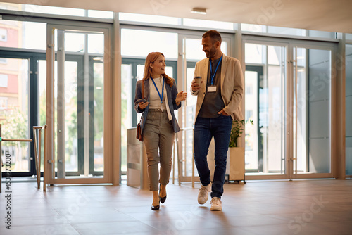 Happy businesswoman and her colleague talking while entering office building.