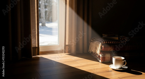 눈 내린 겨울날 따뜻한 실내에 들어오는 햇살