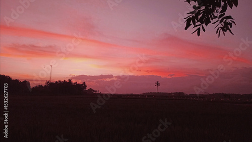 Vibrant Pink and Orange Sunset over Silhouetted Landscape