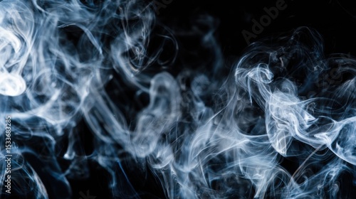 Ethereal wispy tendrils of white and blue smoke twist and flow dynamically against a stark black background, creating a mesmerizing, otherworldly display. The varying densities of the smoke add depth