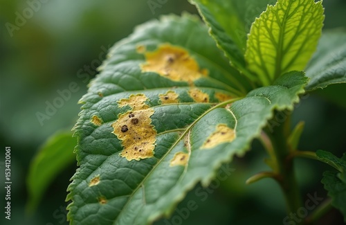 Close-up of tobacco plant leaf shows yellow spots, potential tobacco mosaic virus, fungal infection. Green foliage nature outdoor background, agriculture farming concept. Tobacco leaf damaged by