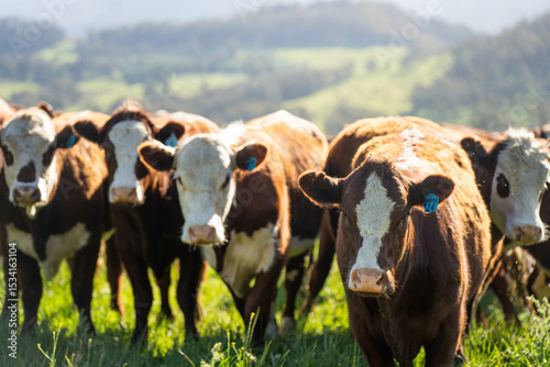 beautiful cattle in Australia eating grass, grazing on pasture. Herd of cows free range beef being regenerative raised on an agricultural farm. Sustainable farming