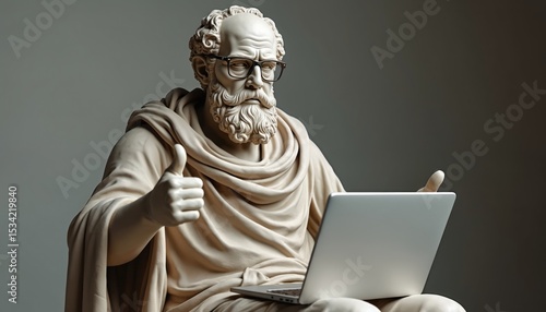 Ancient Greek philosopher statue wears glasses, uses laptop. Giving thumb up. Symbolizing tech integration. Historical, modern blend. Reflecting education, innovation, digital age.