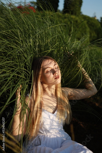 Young woman enjoys sunlight while resting among tall grass in a serene garden setting during golden hour