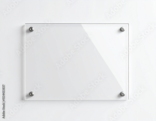 Transparent acrylic signboard with rounded corners, mounted with silver screws on a white wall, soft shadows and minimal clean design, perfect for modern branding or signage mockups