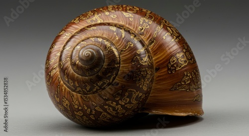 A large, spiraled seashell with intricate, golden-brown patterns on a smooth, glossy surface