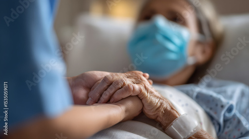 Pflegekraft hält Hand einer Patientin mit Maske im Krankenhausbett