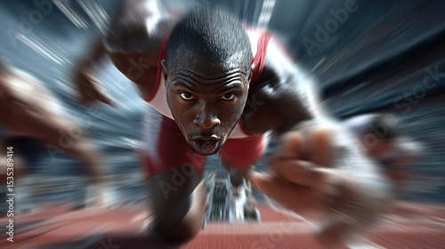 Track and field sprinters run at full speed on the track, with focused attention and firm determination, demonstrating speed and competitive spirit in sports.