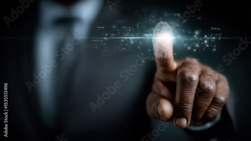 Businessman using fingerprint identification to access personal financial data.