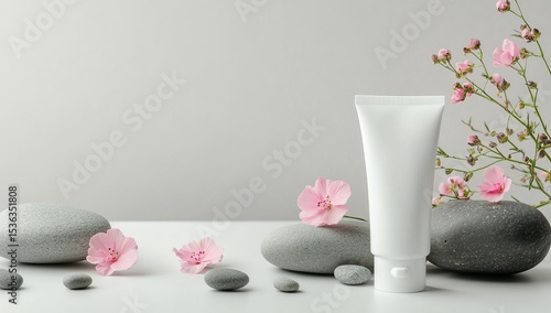 Photo of a white tube mockup with pink flowers and gray stones on a light gray background, in a flat lay. Space for text. On the right side is an empty space to add your own product or service details