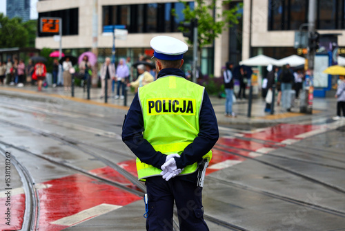 Policjantka z lizakiem do zatrzymywania pojazdów kontroluje ruch drogowy
