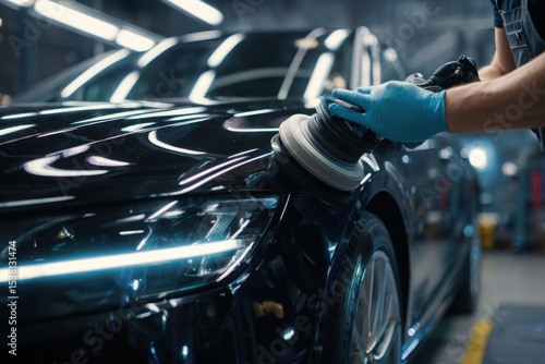 Car detailing and polishing concept of professional man car service worker with orbital polisher polishing black luxury car in auto repair shop