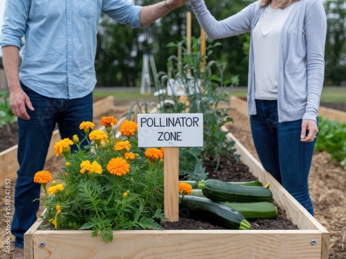 Sustainable Companion Plants Gardening concept. Gardening couple tending to a pollinator zone with flowers and vegetables in a raised bed.