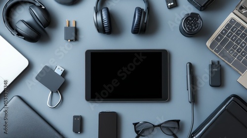 Stylish workspace setup with tablet, headphones, keyboard, and various digital accessories on gray background, showcasing contemporary technology and productivity