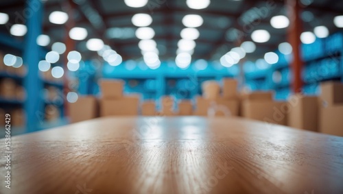 Empty table top with warehouse cordial background, supply store, and wooden pallet.