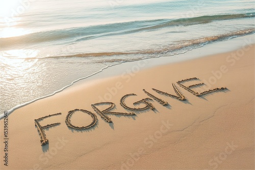 forgive word on beach sand in morning.