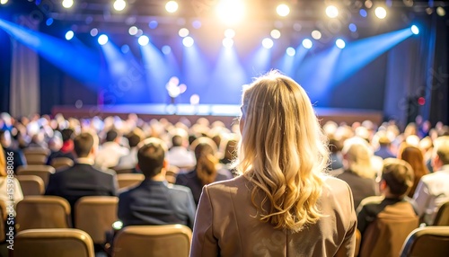 Woman at conference with stage lights.