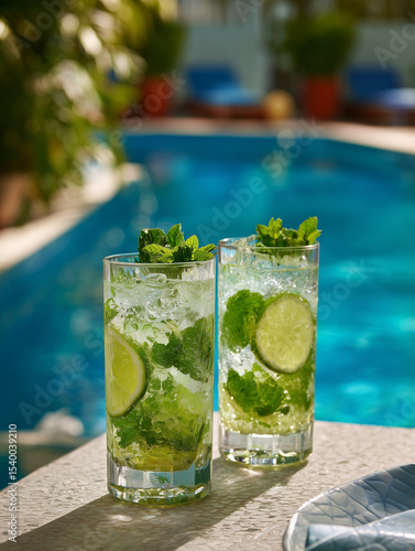 Dwa orzeźwiające koktajle mojito z miętą i limonką, stojące na jasnym blacie przy basenie. Idealne na letnie popołudnie w upalny dzień.