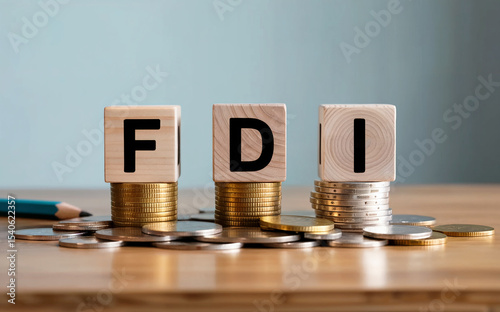 Wooden Blocks Spelling FDI on Stacks of Coins Representing Foreign Direct Investment