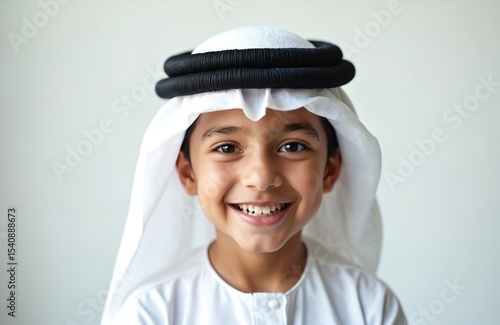 Happy, joyful boy wears traditional Emirati clothing ghutra. Smiling child with genuine expression, cheerful face. Portrait against white background studio. Arabian culture, youth, childhood, Middle