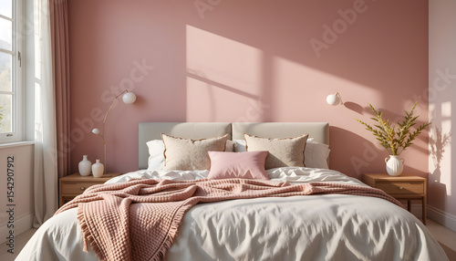 Generative AI image of comfortable bed with pillows and blanket near pink wall in spacious bedroom during daytime