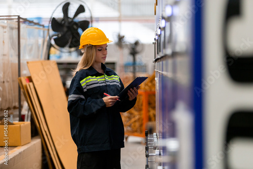 Women paper warehouse worker check quality and quantity cardboard corrugated carton in storage stock product with computer system at CNC automation. Large industry in paper production line.