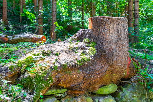 Sawn off tree stump trees stumps in the forest Tyrol Austria.