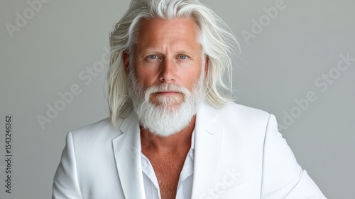 A captivating portrait of a distinguished older man with long gray hair and a well-groomed beard, exuding charisma and confidence while wearing a stylish white suit.