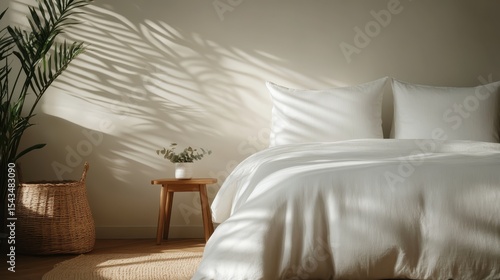 A serene and inviting bedroom featuring soft shadows and gentle light filtering through the arrangement of pillows and plant, exemplifying a tranquil modern retreat for relaxation.