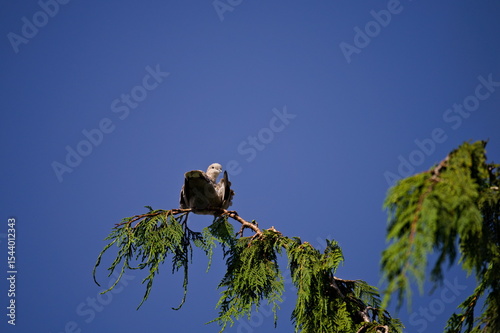 Gołąb Sierpówka na gałęzi cedru na tle nieba